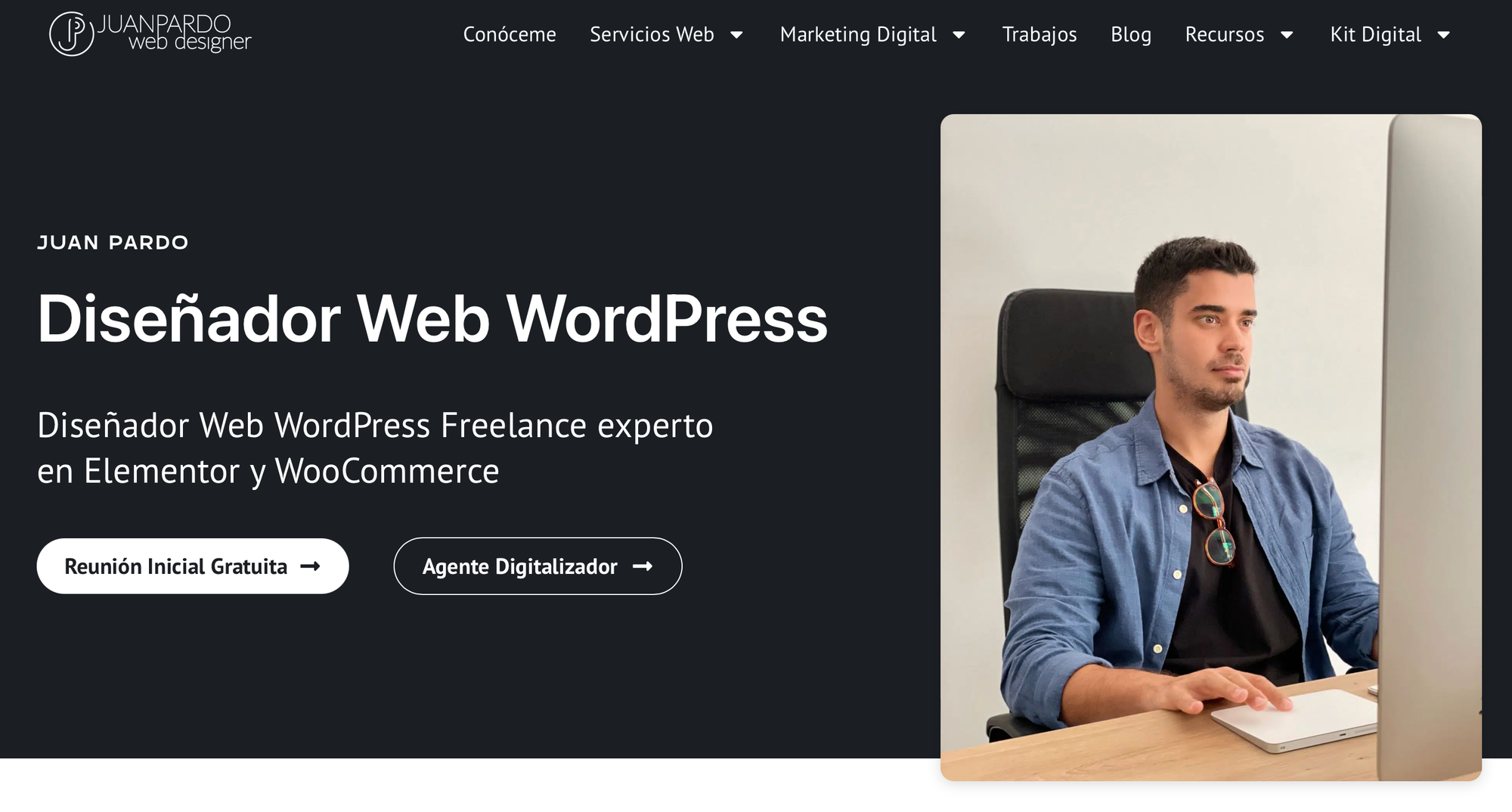 Juan Pardo es diseñador web freelance especializado en WordPress y Elementor, con más de diez años de experiencia y más de 100 proyectos entregados. Es experto certificado en Elementor y también consultor SEO y SEM — una combinación poco habitual que hace que sus webs estén pensadas tanto para verse bien como para posicionarse.